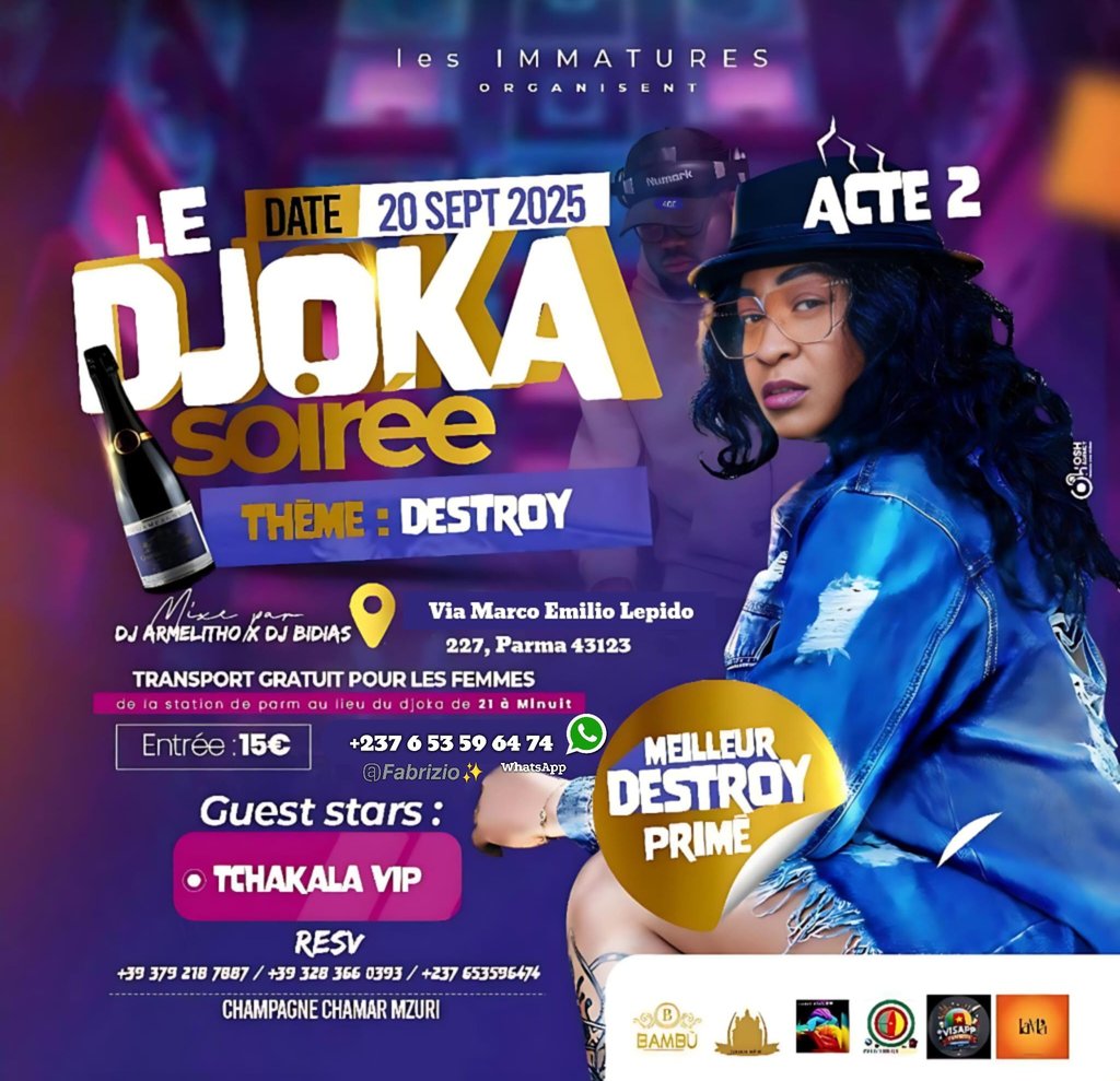 "Le Djoka destroy party" (JDP) est évènement culturel organisé par le groupe "Les Immatures" très connue en Italie c'est un évènement ressemblant la communauté Camerounaise présente en Italie. La première édition à eu lieu le 21 septembre 2024 et la deuxième au lieu cette année le 20 septembre 2025 à Parma (Italie) C'est un évènement très mouvementée qui rassemble plusieurs artiste et influenceurs de la diaspora Camerounaise…