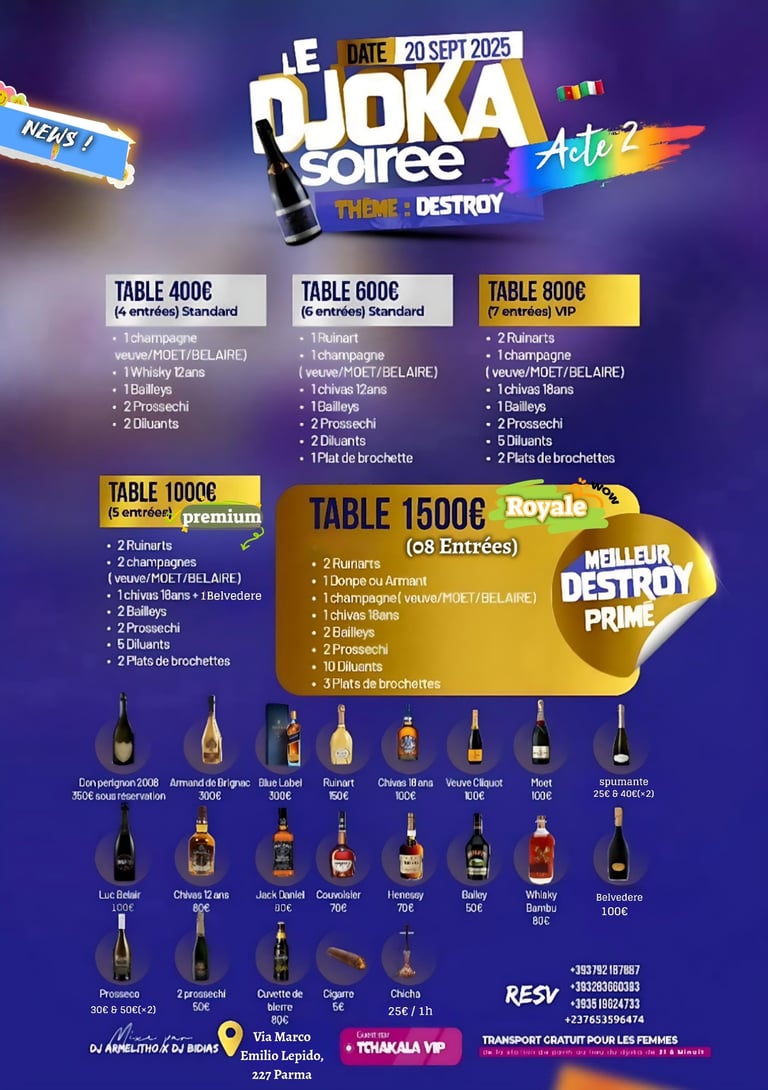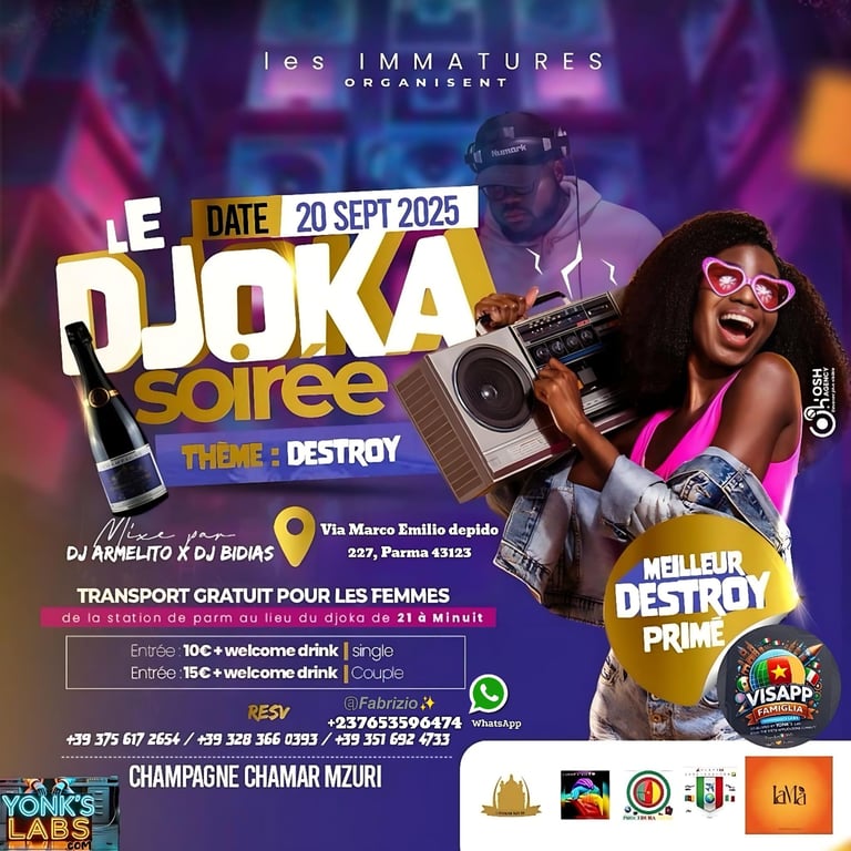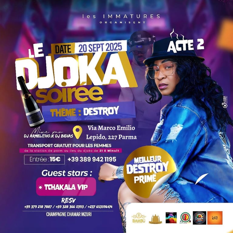 Le Djoka Destroy Party (JDP) est un événement culturel captivant, organisé par le groupe 'Les Immatures', connu pour sa forte influence en Italie. Cet événement constitue une plateforme où la communauté camerounaise en Italie se rassemble pour célébrer sa culture, ses traditions et son unité. La première édition a eu lieu le 21 septembre 2024, marquant le début d'une aventure attendue par beaucoup. La deuxième édition s'est entièrement déroulée le 20 septembre 2025 à Parme, renforçant ainsi l'importance de cet événement dans le calendrier culturel de la diaspora camerounaise.